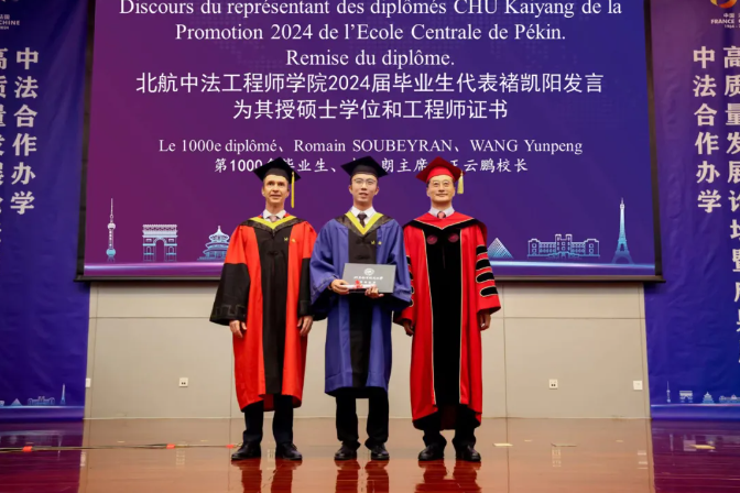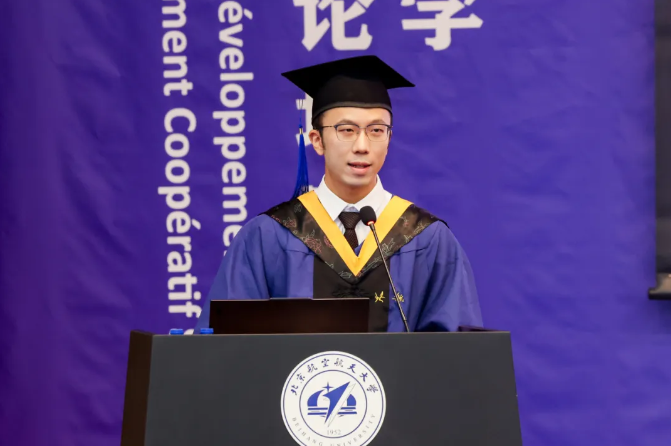 As the 1,000th graduate of Sino-French Engineer School of Beihang University, Chu Kaiyang gave a speech in French and Chinese, expressing his gratitude to all the leaders and teachers who have supported the school's development and worked hard for its growth.